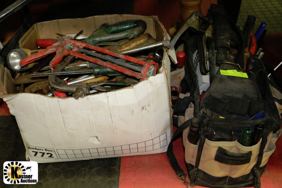 CANVAS TOOL BAG WITH CONTENTS AND BOX OF TOOLS