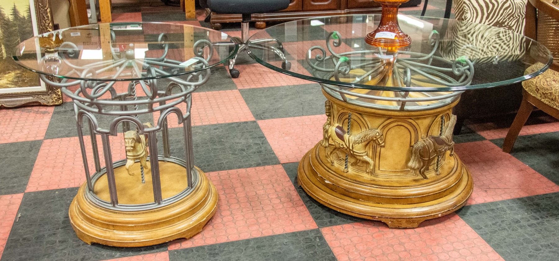 ( 26" DIAMETER ) SET WITH GLASS TOPS - SOME DINGS AND CHIPS ON SIDE OF GLASS**ALL ITEMS MUST BE REMOVED BY 5PM MONDAY, OCTOBER 10TH, 2022. ALL REMAINING ITEMS WILL BE SUBJECT TO A $6.00 PER DAY STORAGE CHARGE. ANY ITEMS REMAINING AFTER MONDAY, OCTOBER 24TH, 2022 WILL BE CONSIDERED FORFEITED. NO REFUNDS WILL BE ISSUED FOR FORFEITED ITEMS. TO SCHEDULE A PICK UP APPOINTMENT CLICK HERE