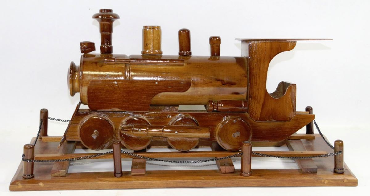 CARVED WOODEN TRAIN ENGINE ON DISPLAY