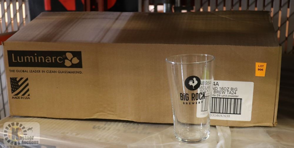CASE OF 24 ROCK BREWERY BEER GLASSES.