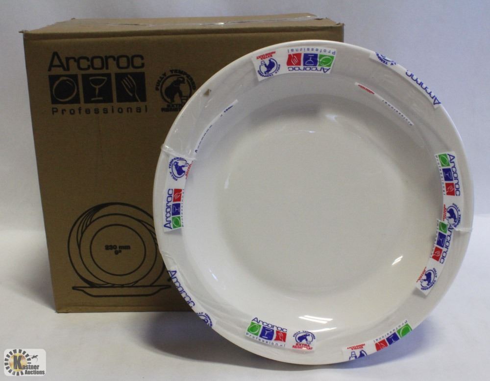 MADE IN FRANCE. ARC03-NEW, 1 CASE OF 24 ARCOROC 7438 OPAL CYPRESS 9" IVORY PELLET PLATE. FULLY TEMPERED & EXTRA RESISTANT. ONLINE $135.00 US PER CASE.