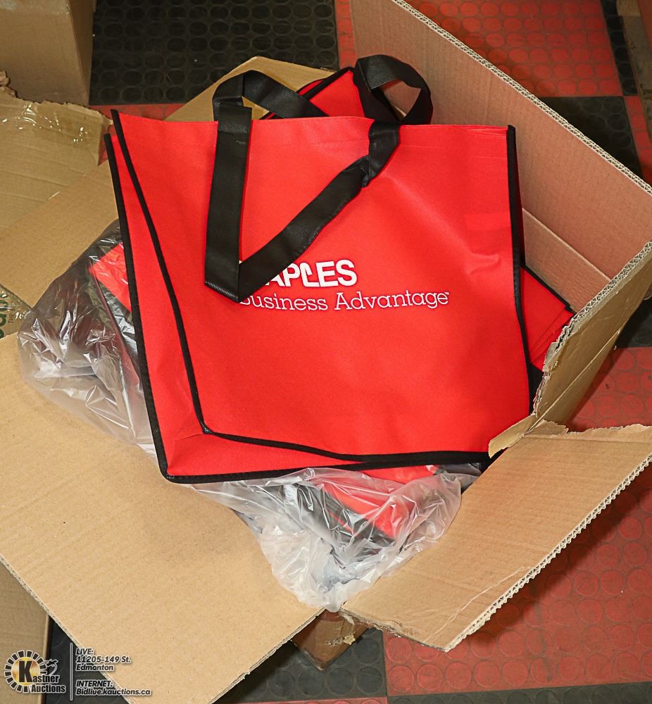 CASE WITH 100 RED /BLACK STAPLES SHOPING BAGS