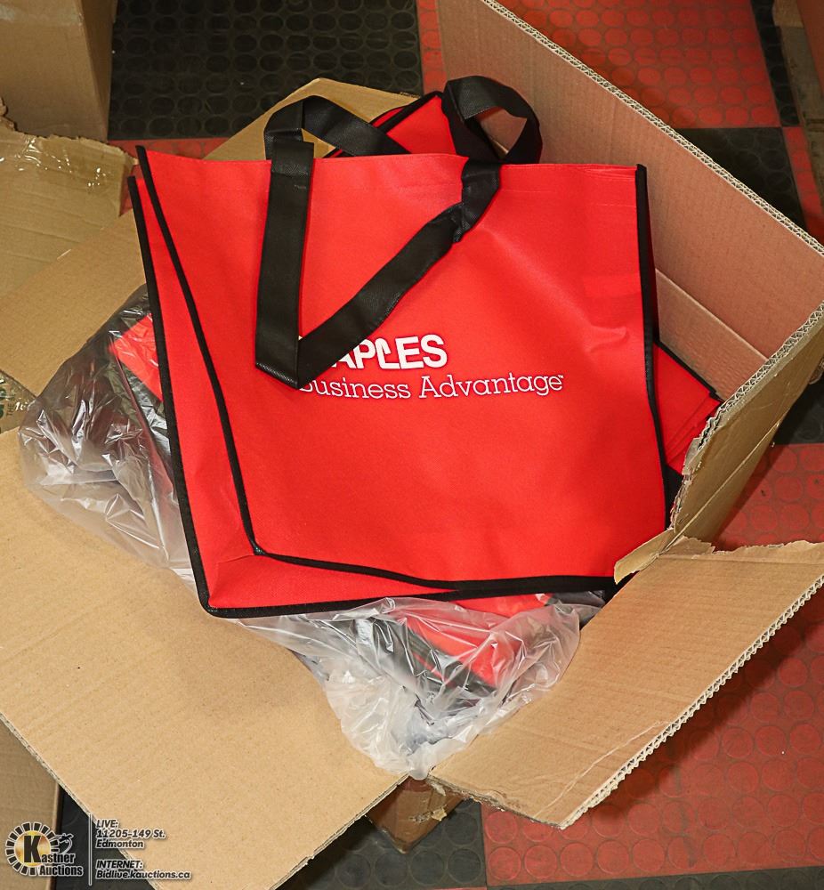 CASE WITH 100 RED /BLACK STAPLES SHOPING BAGS