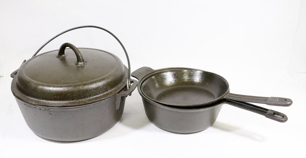 8" FRY PAN, 8.5" POT, 10" COVERED DUTCH OVEN/CASSEROLE POT. OUTDOORS