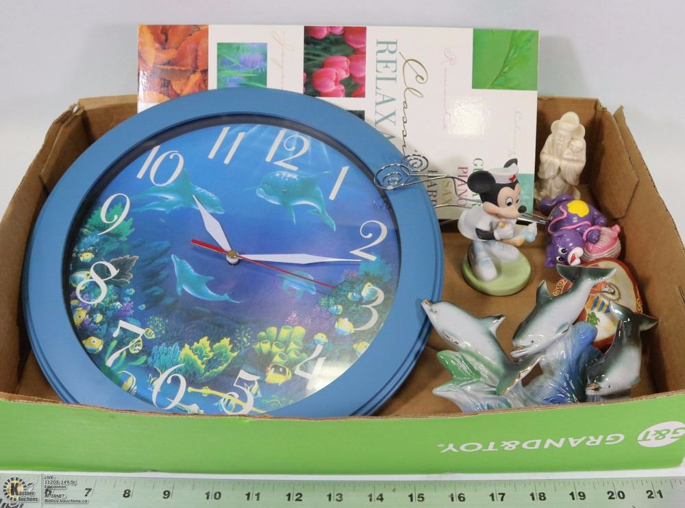 LARGE DOLPHIN CLOCK (12 INCHES TALL) DOLPHIN CERAMIC FIGURINE AND OTHER VINTAGE FIGURINES FROM DIFFERENT ERA'S. CLASSICAL RELAXATION CD SET, 4 CD SET ONE GUITAR CD ONE PIANO CD ONE HARP CD AND ONE SAX CD ALL IN A GIFT BOX COLLECTABLES