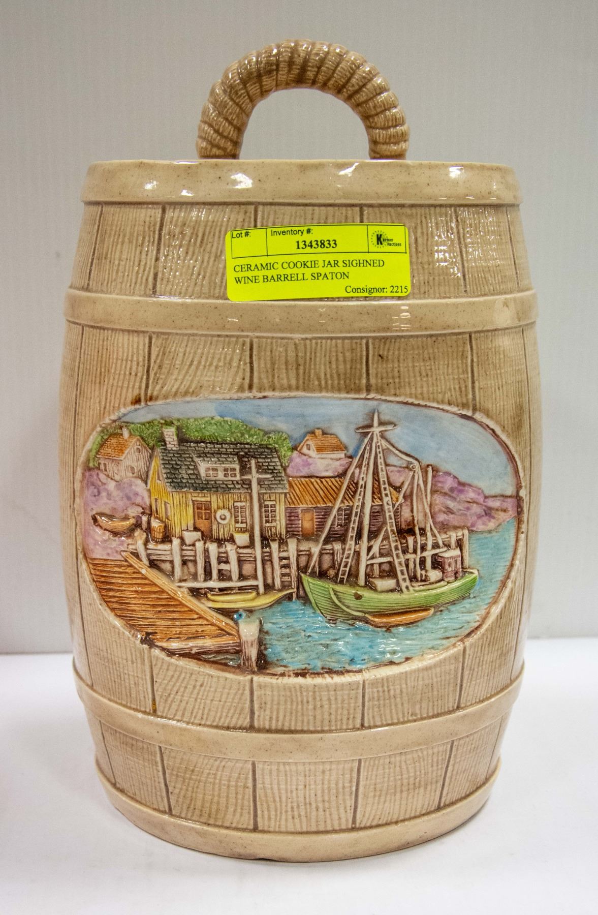 CERAMIC COOKIE JAR SIGNED WINE BARREL SPATON