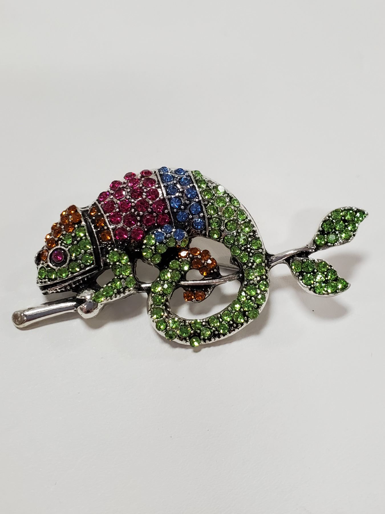 CHAMELEON ON A BRANCH RHINESTONE BROOCH