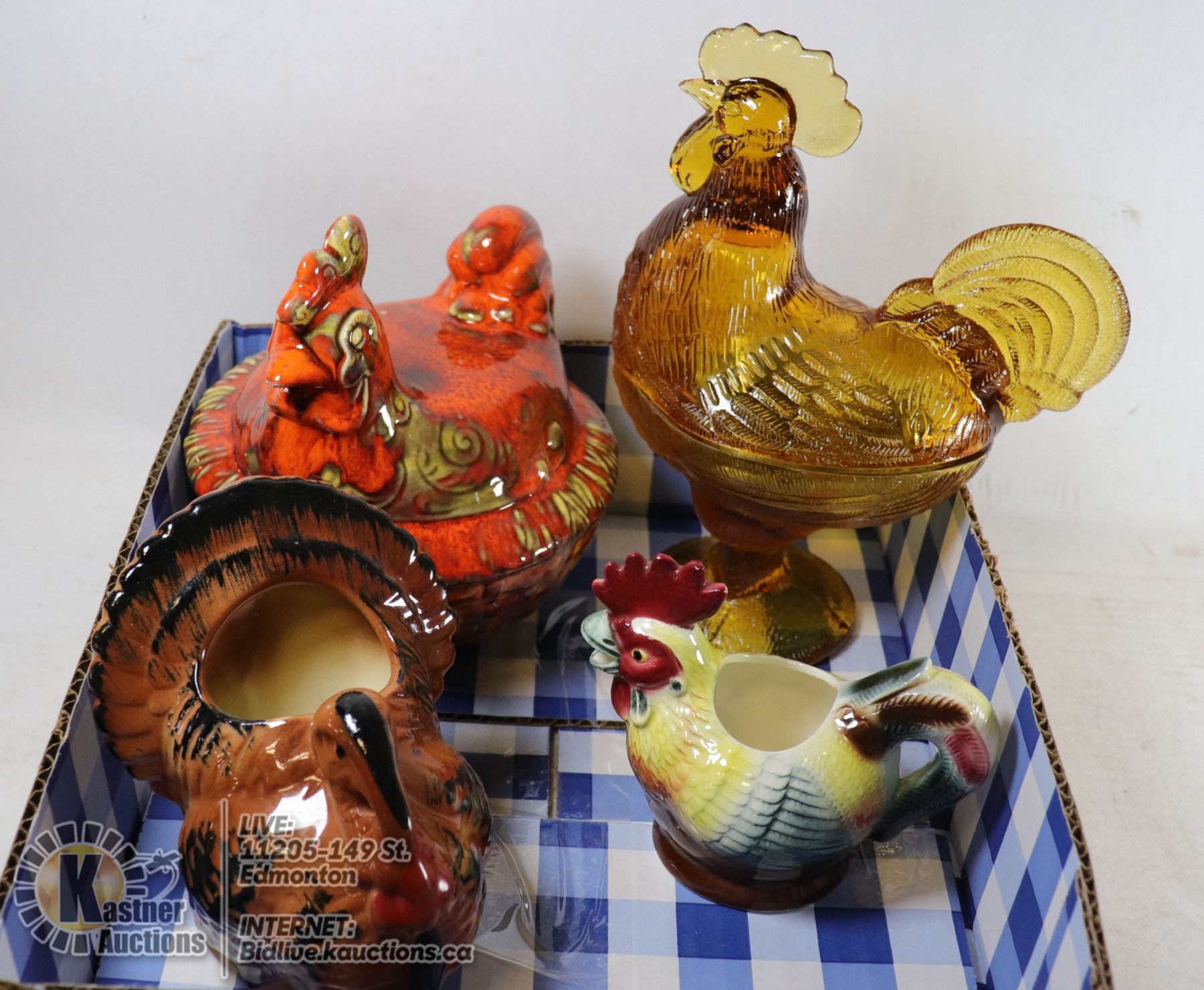 CHICKEN LOT. VINTAGE AMBER GLASS 9" ROOSTER CANDY DISH; CERAMIC HEN ON NEST, OTHERS. COLLECTIBLE