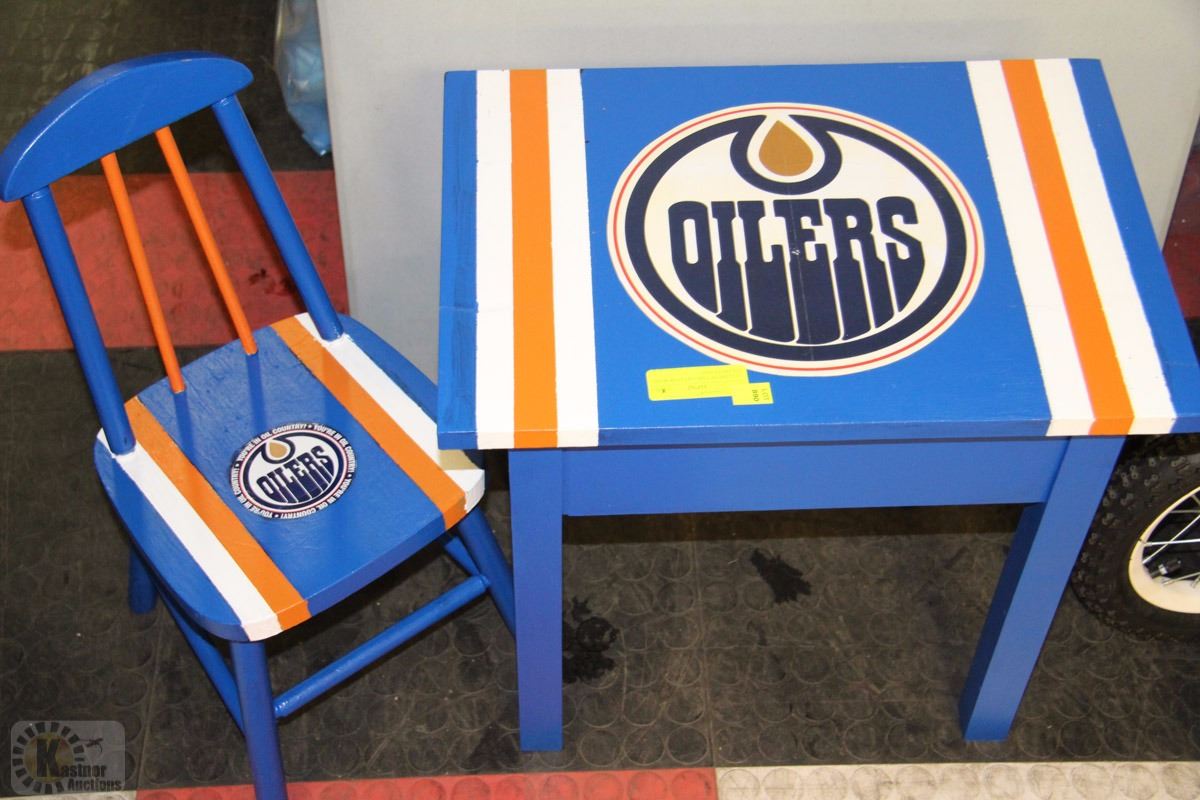 CHILDRENS TABLE & CHAIR WITH OILERS DESIGN