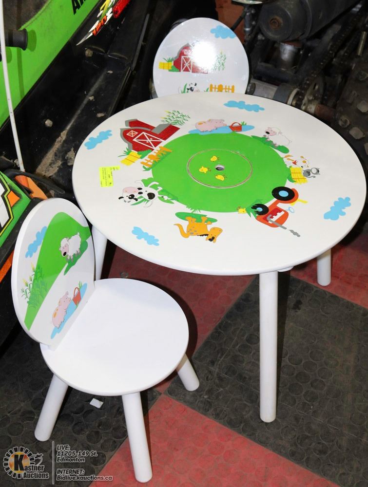 CHILDS WHITE TABLE W/ STORAGE IN CENTER & 2 CHAIRS