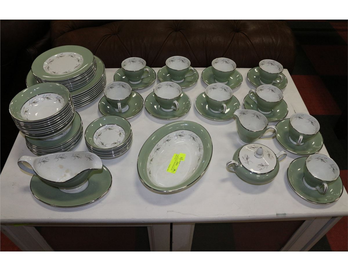 INCLUDES 10 TEA CUPS & SAUCERS, 8 DINNER PLATES, GRAVY BOAT & TRAY, CREAMER & SUGAR DISH, 8 DESSERT DISHES, 9 BREAD PLATES, 9 SALAD PLATES, 9 SOUP BOWLS & A SERVING DISH