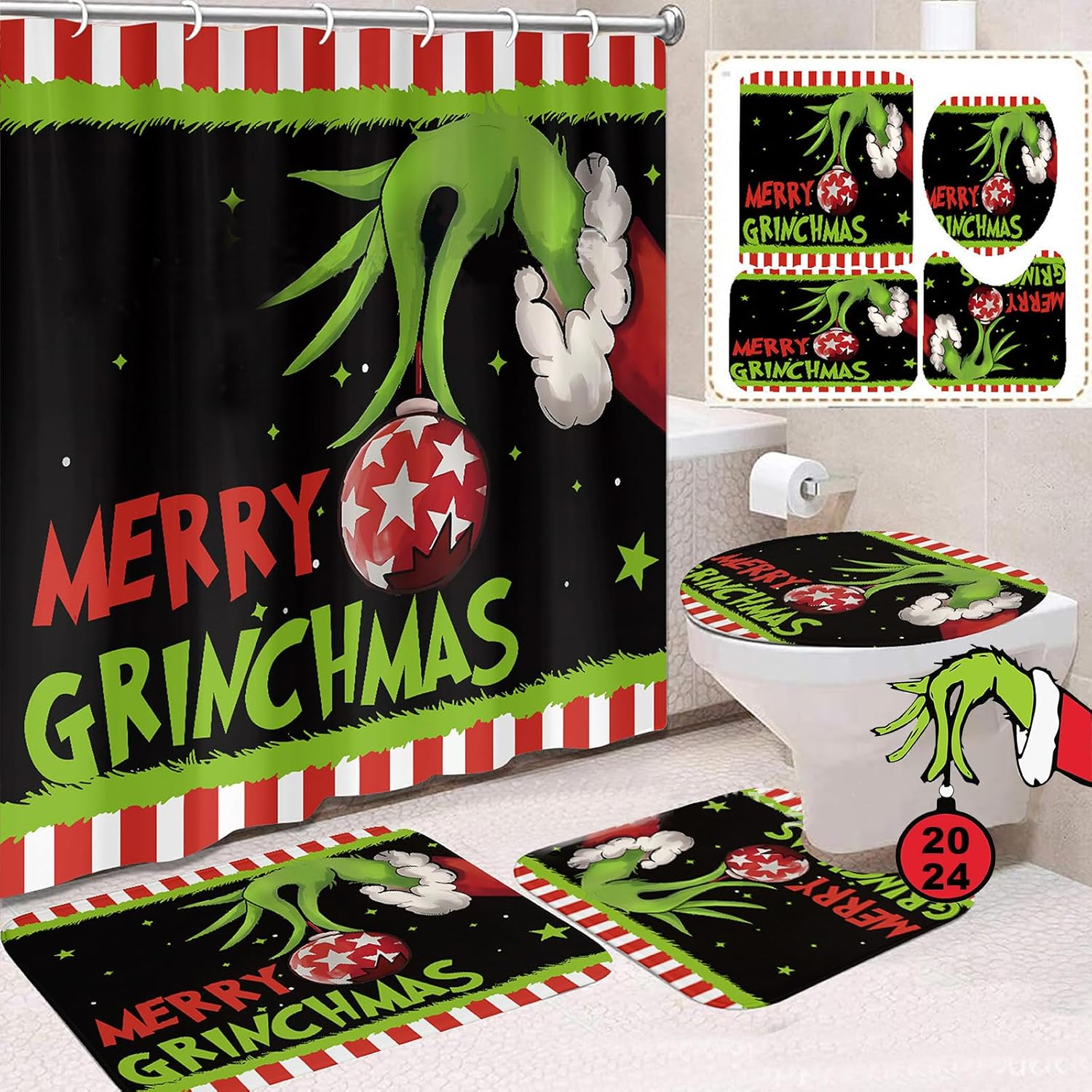 CHRISTMAS SHOWER CURTAIN SET-4 PIECE BATHROOM SET WITH SHOWER CURTAIN AND RUGS- CHRISTMAS DECORATION WITH HOOKS, 71"*71 (B-BLACK-GRH) | Category: Home Goods & Decor