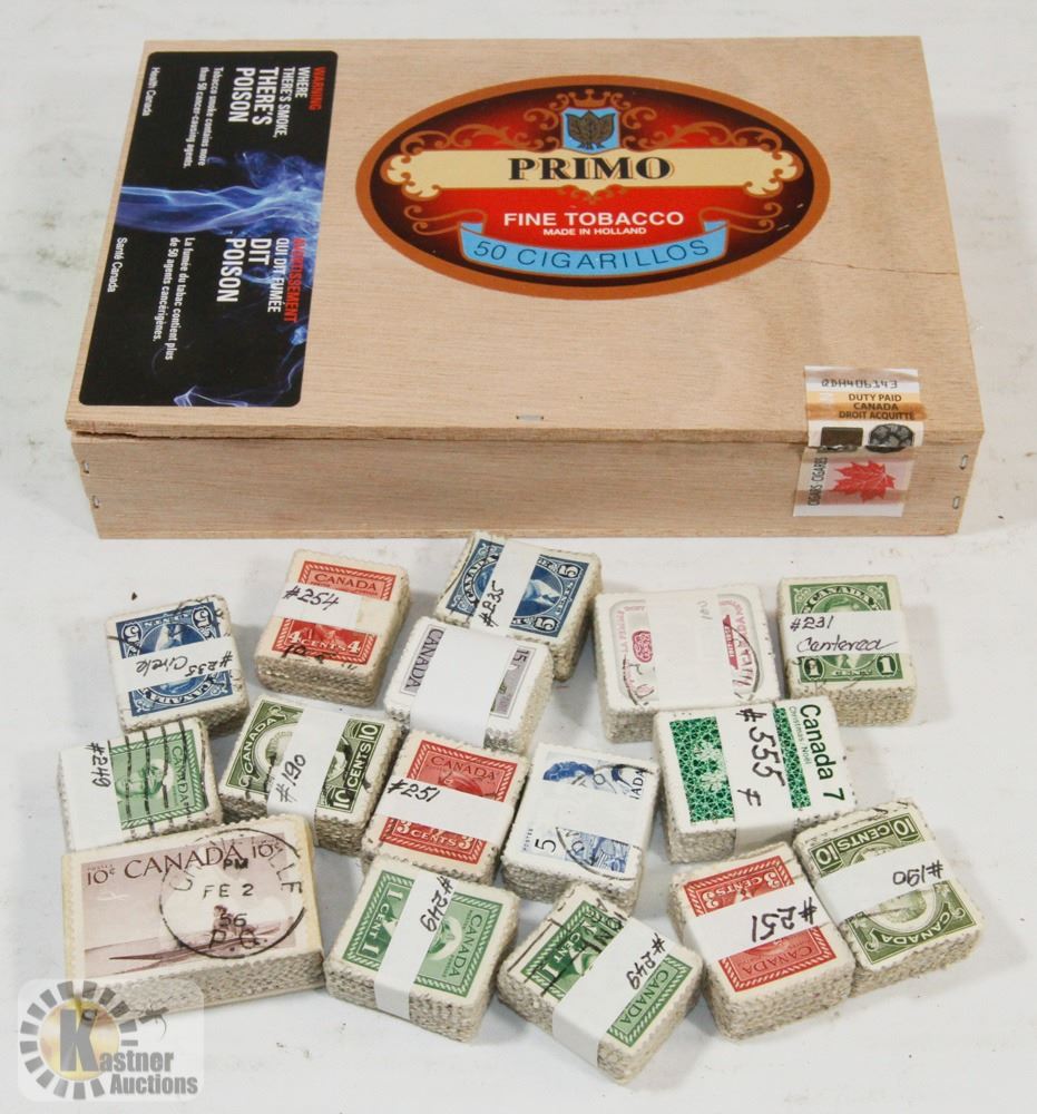 CIGAR BOX FULL OF 100 LOT VINTAGE CANADIAN STAMPS