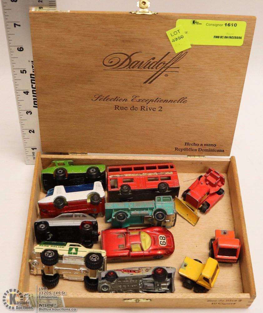 CIGAR BOX FULL OF HOTWHEELS AND MATCHBOX TOY CARS