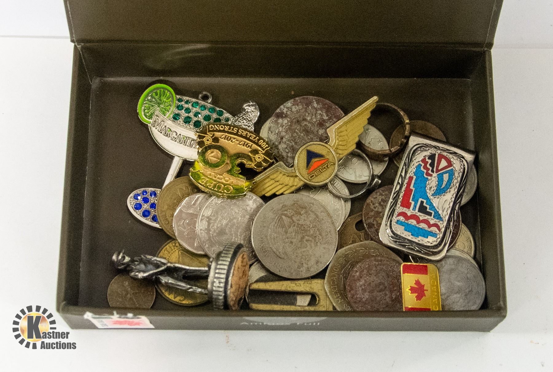 CIGAR BOX FULL OF PINS,COINS,SILVER $ CLIP &