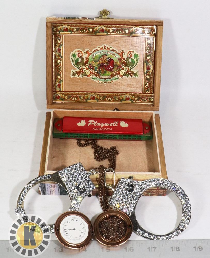 CIGAR BOX W/ HARMONICA HANDCUFFS AND LOCKET