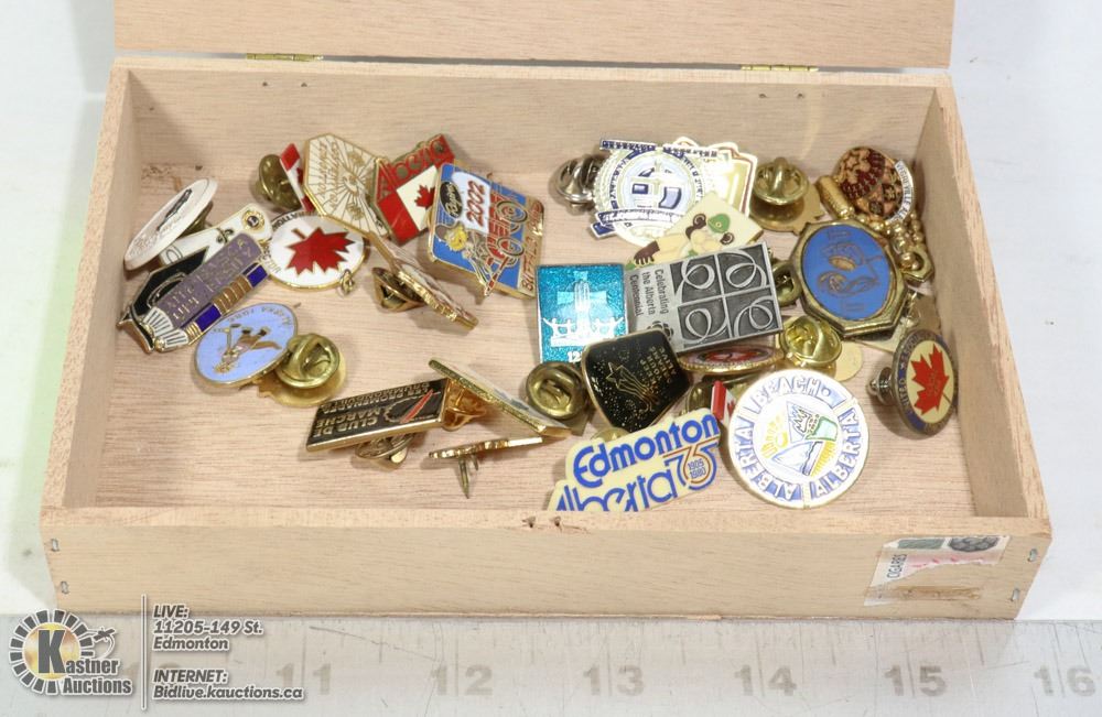 CIGAR BOX WITH 30 VINTAGE LAPEL PINS