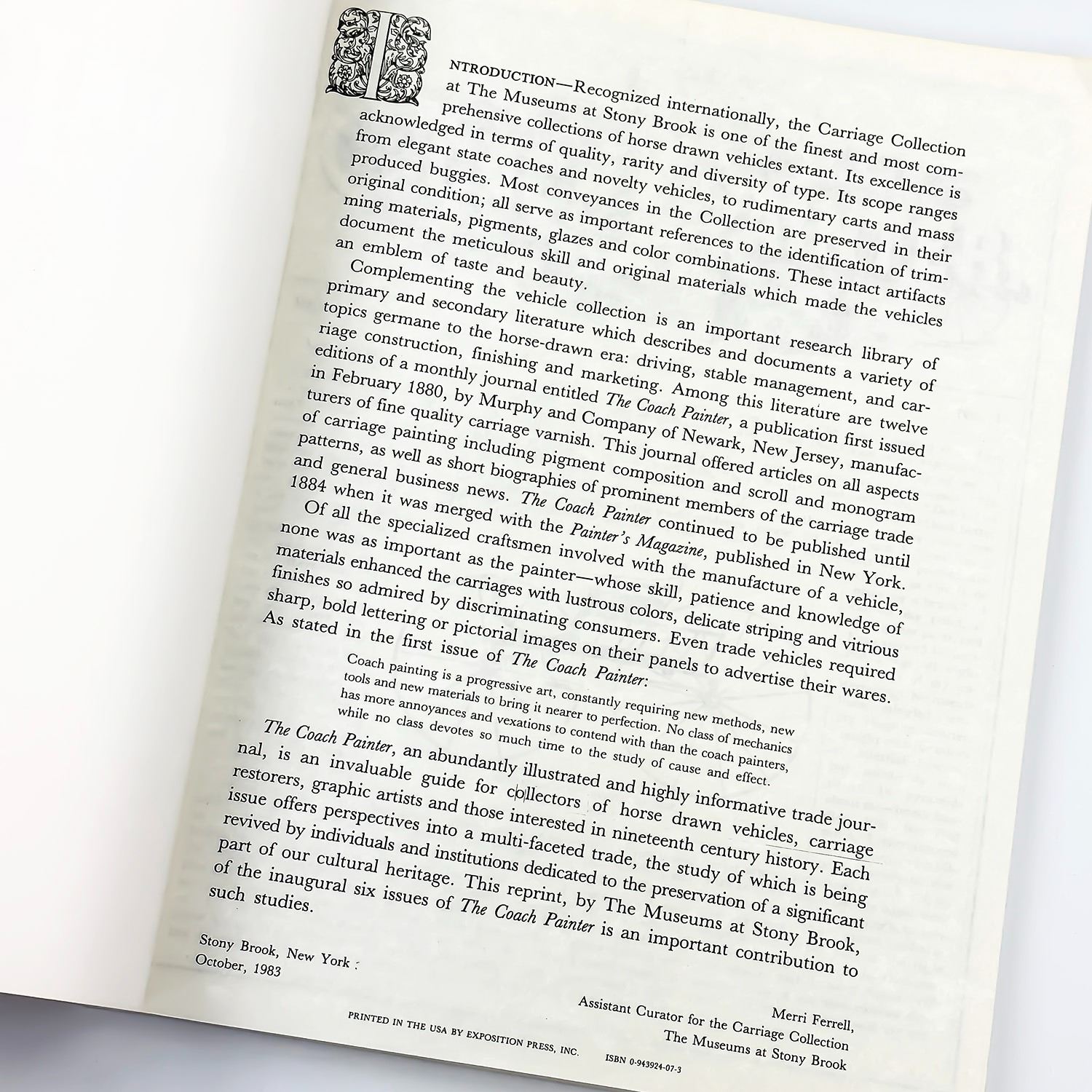 #8788 - HISTORICAL INFORMATION ON VINTAGE HORSE DRAWN CARRIAGES FROM THE MUSEUMS AT STONY BROOK, NEW YORK. SOFTCOVER - EXPOSITION PRESS , INC. 1983 - 116 PAGES MEASURES: 9” X 11”