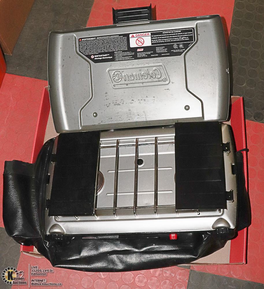 LEATHER CARRYING CASE WITH HANDLES HOLDS TWO PROPANE BOTTLES IN SIDE POCKETS (BOTTLES NOT INCLUDED)AS WELL AS PROPANE STOVE.-GENERAL