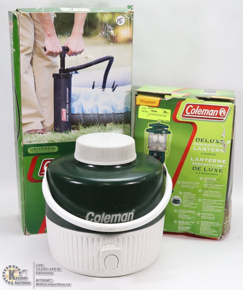 COLEMAN LANTERN, HAND PUMP, WATER JUG