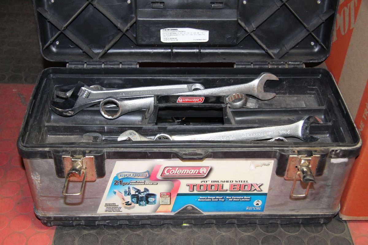 COLEMAN TOOL BOX WITH ASSORTMENT OF WRENCHES