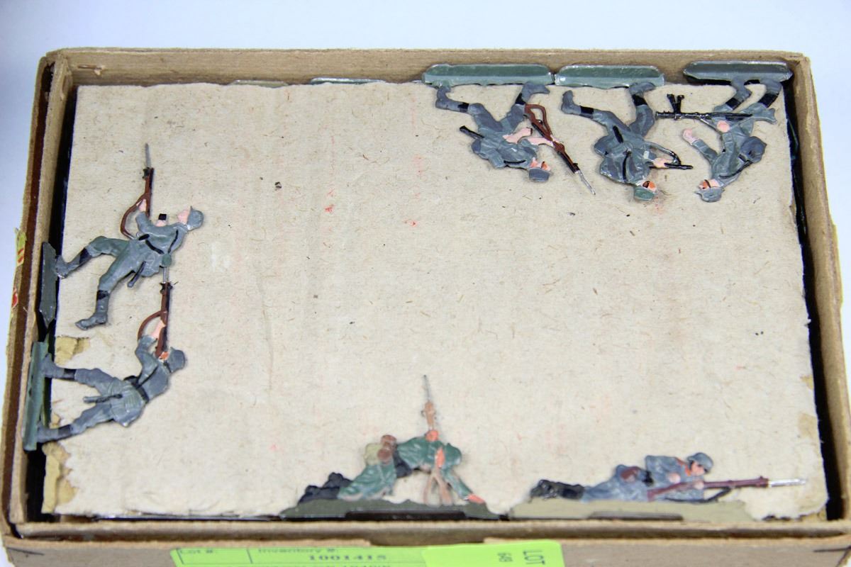 INCLUDES: 2 MOTORCYCLE & SIDECHAIR, 5 RIDER & BIKE, 1 PYRAMID OF RIFLES, AND 21 INFANTRY "ZINNFIGUREN" - 2 DIMENSIONAL DIE CAST FIGURES MADE OF ZINN HAND PAINTED TO APPEAR 3-D "ZINN" - MIXTURE OF TIN & LEAD