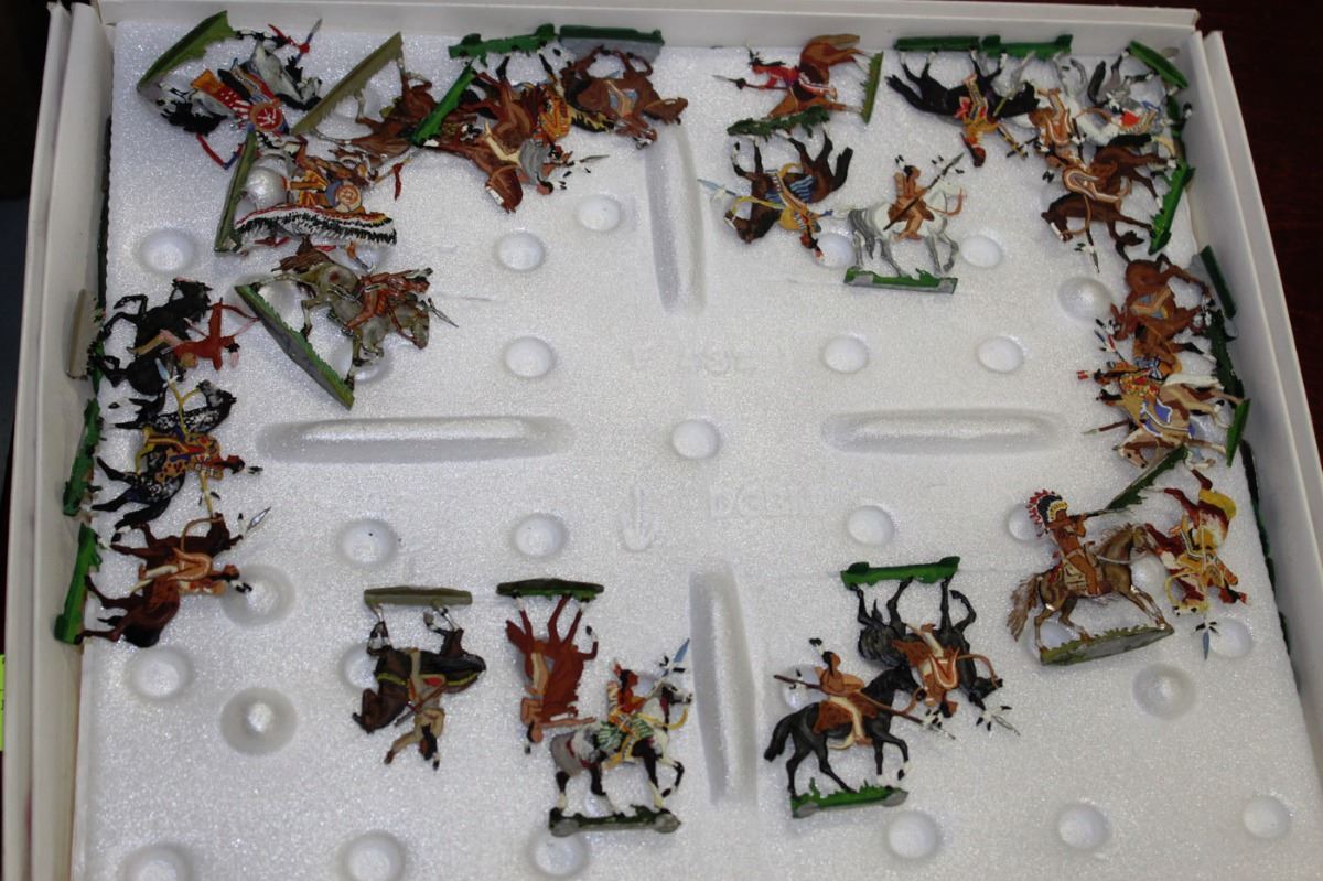 TRAPPERS INCLUDES: 32 MOUNTED INDIANS, 5 TRAPPERS, 26 INDIANS ON FOOT, 3 HORSE & SLEDS, 3 TEEPEES, AND 5 DOGS & SLEDS "ZINNFIGUREN" - 2 DIMENSIONAL DIE CAST FIGURES MADE OF ZINN HAND PAINTED TO APPEAR 3-D