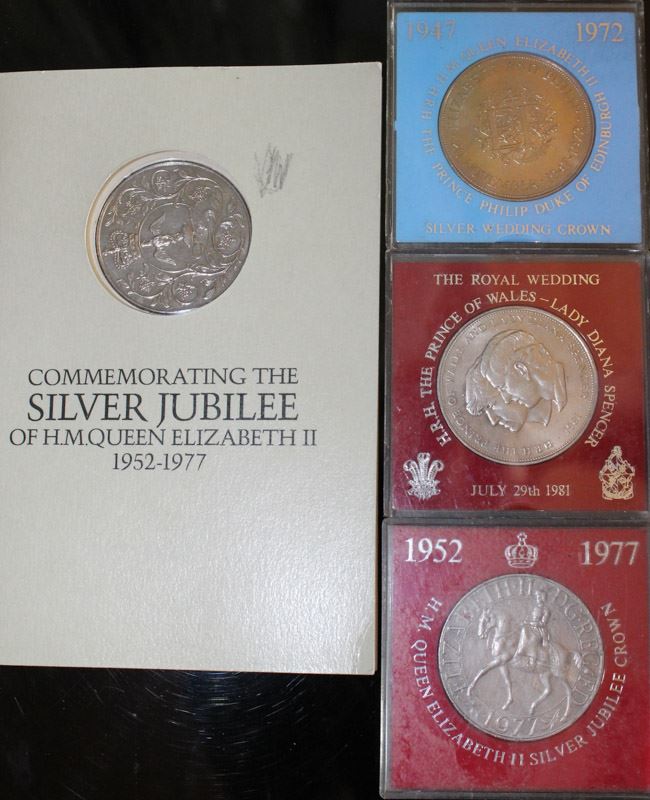 SILVR WEDDING CROWN, 1981 WEDDING OF PRINCE CHARLES & LADY DIANA SPENCER, 2 SILVER JUBLILEE QUEEN ELIZABETH 1952-1977