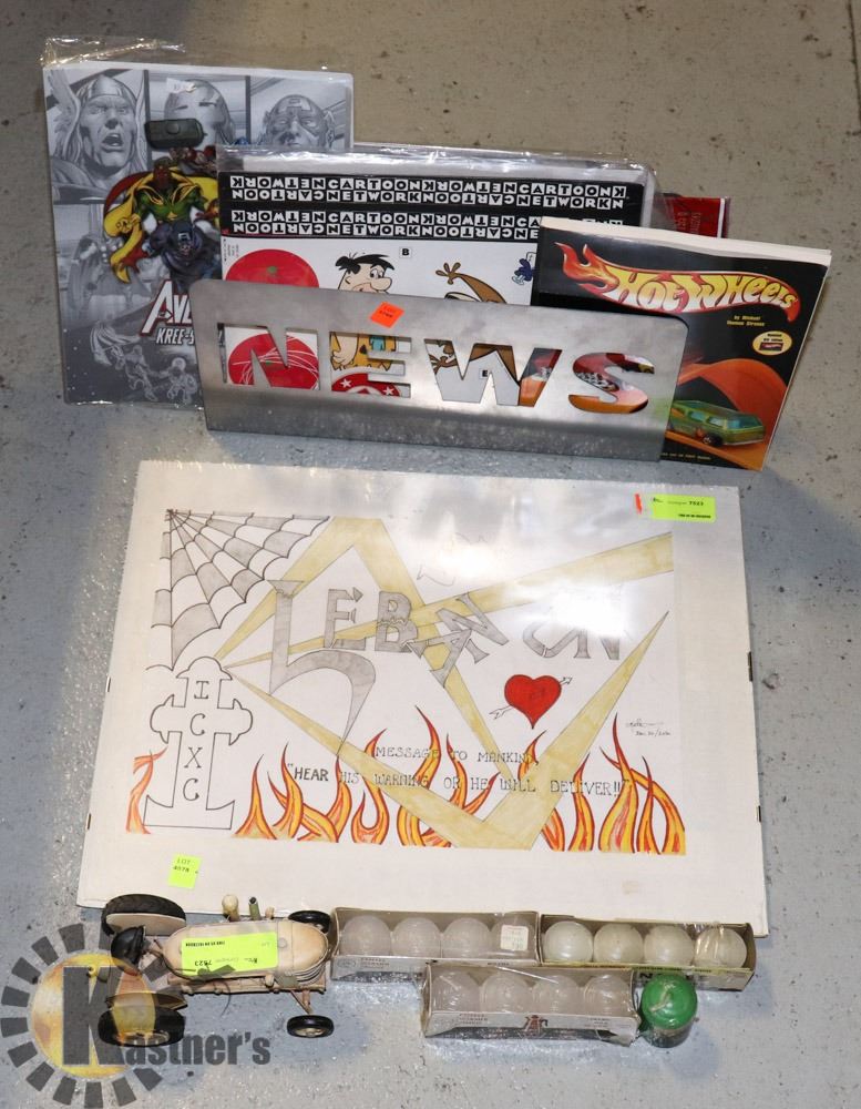 COLLECTION OF ART, BINDERS, BOOKS, CANDLES,