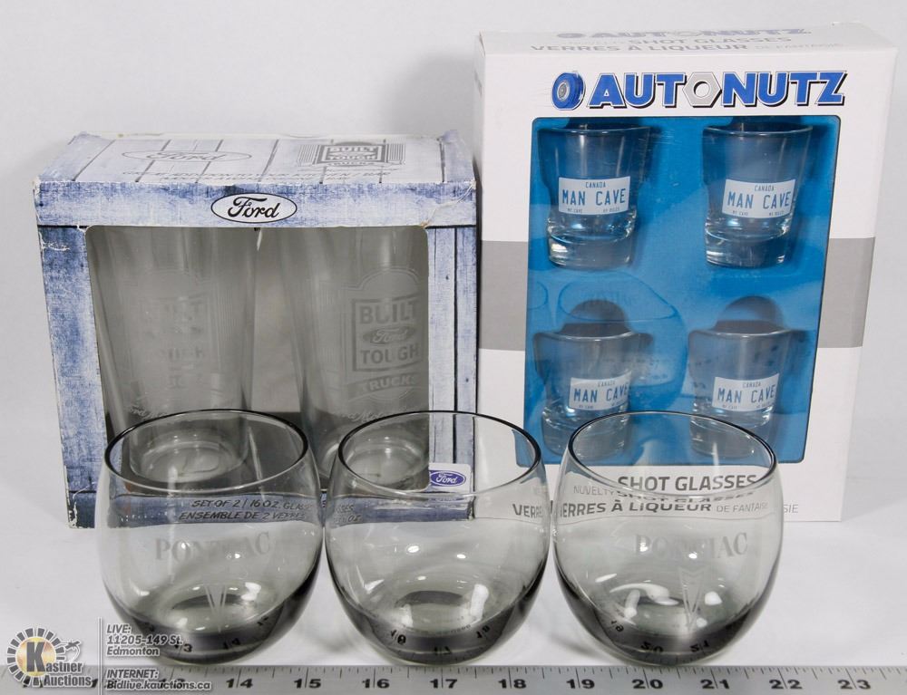 FORD TRUCK16OZ GLASSES, PONTIAC GLASSES, AND AUTO NUTZ SHOT GLASSES