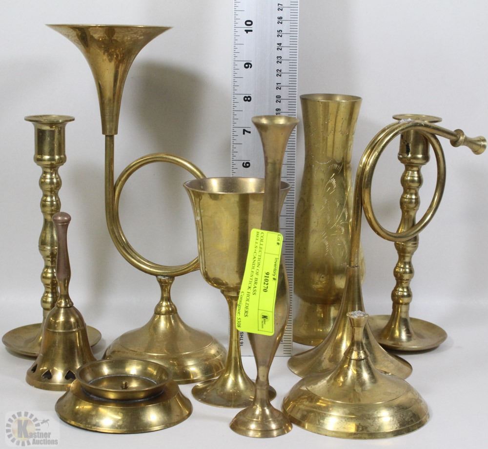 COLLECTION OF BRASS BELLS+CANDLESTICK HOLDERS