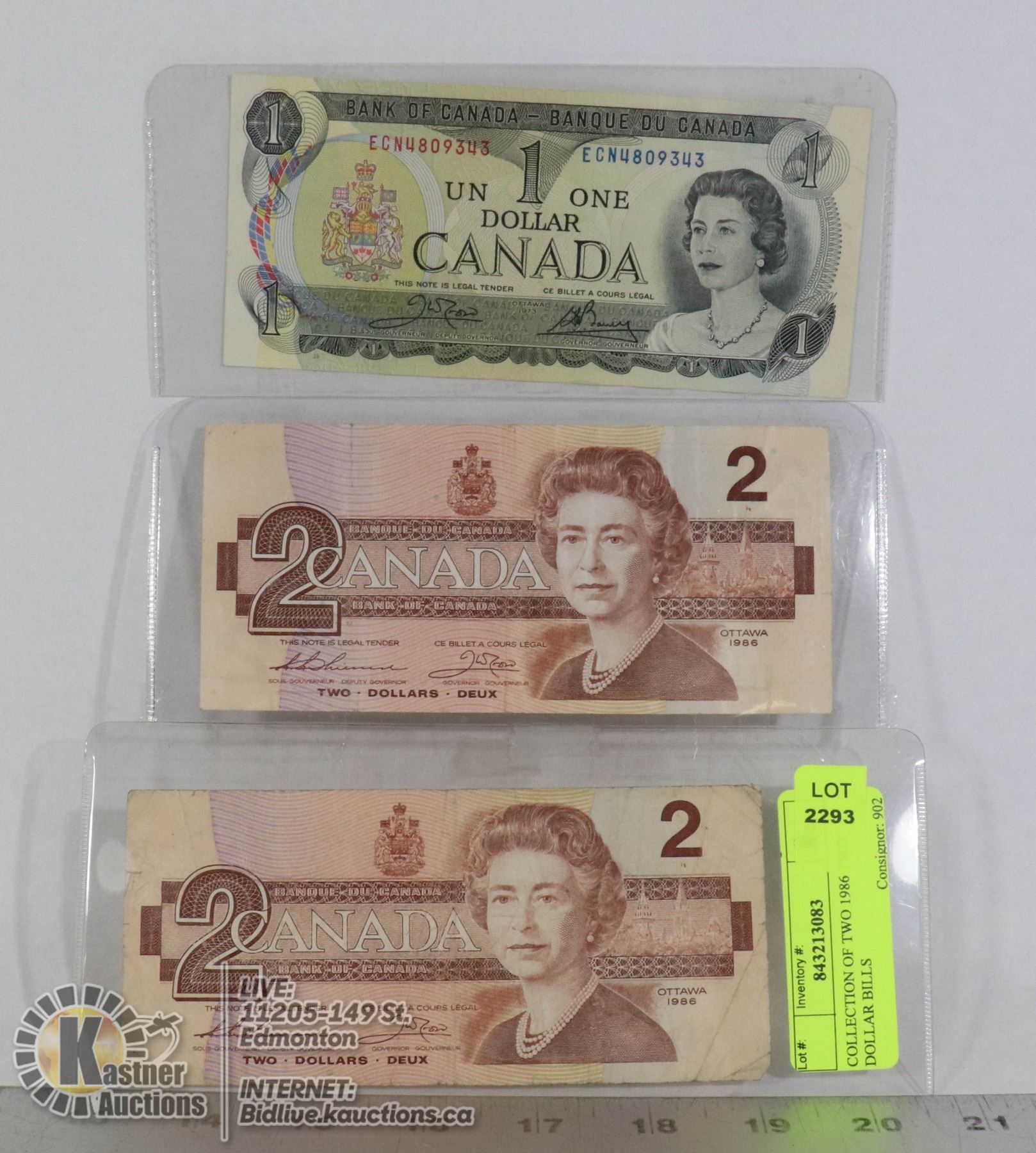 COLLECTION OF TWO 1986 $2 BILLS & ONE 1973 $1 BILL