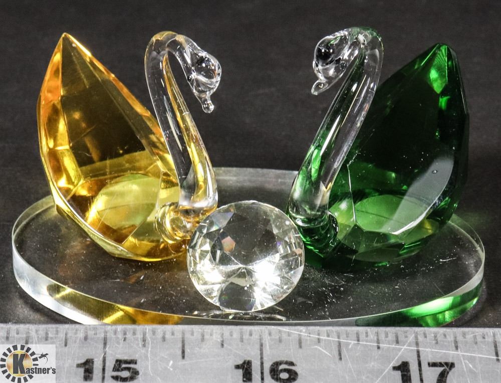 COLORED GREEN AND AMBER CRYSTAL SWANS