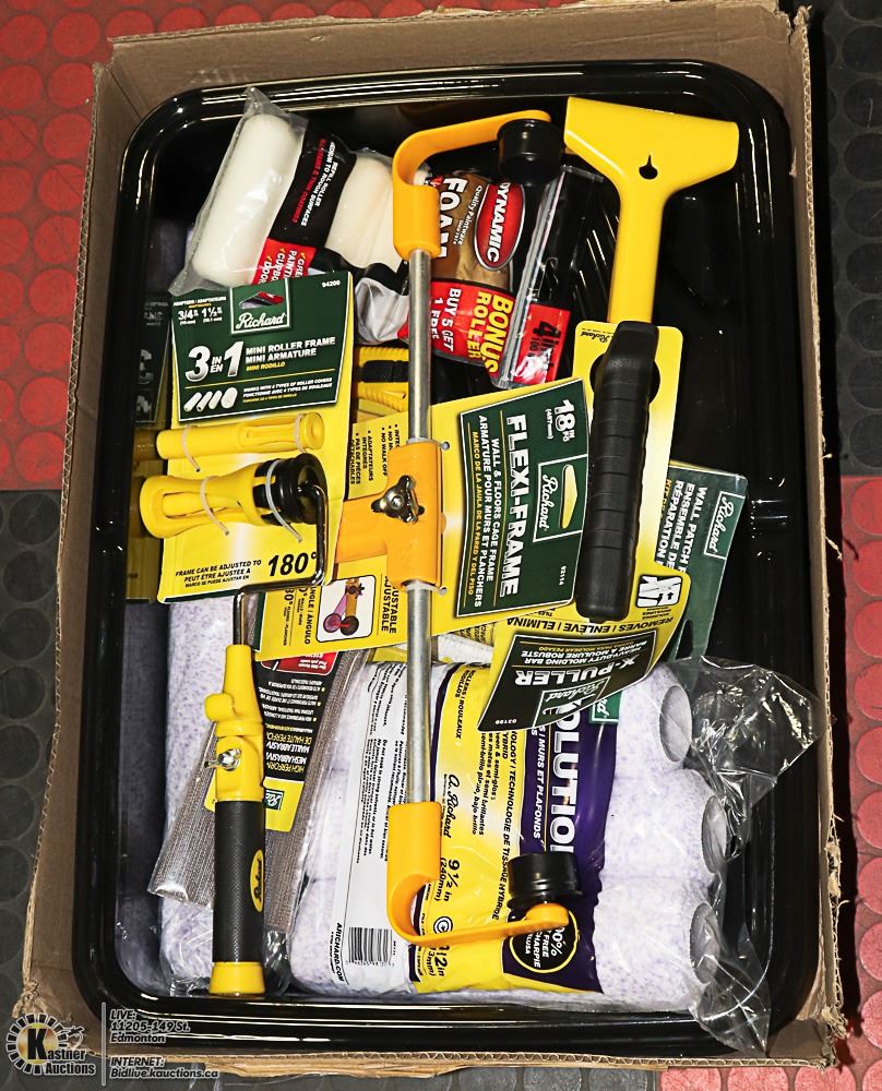 PAINTER'S SET INCL. FLEXI-FRAME 18 INCH WALL & FLOOR CAGE FRAME W/NEW 18 INCH ROLLER (ADJUSTABLE WIDTH) AND 3 X 9.5"-ROLLERS, 3-IN-1 MINI ROLLER FRAME & ROLL REFILLS, WALL REPAIR KIT, X-PULLER HEAVY DUTY MOLDING BAR, NEW EXACTO KNIFE & MORE -GENERA