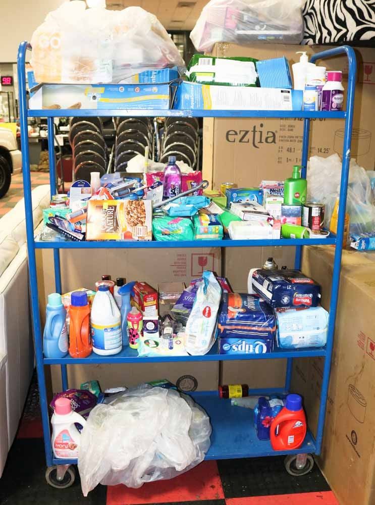 LARGE ASSORTMENT OF MISC. HOUSHOLD SUPPLIES -RACK NOT INCLUDED