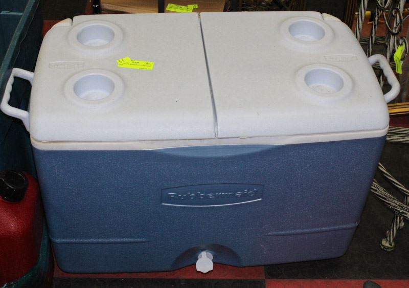 COOLER ON WHEELS W/ 2 THERMOS JUGS