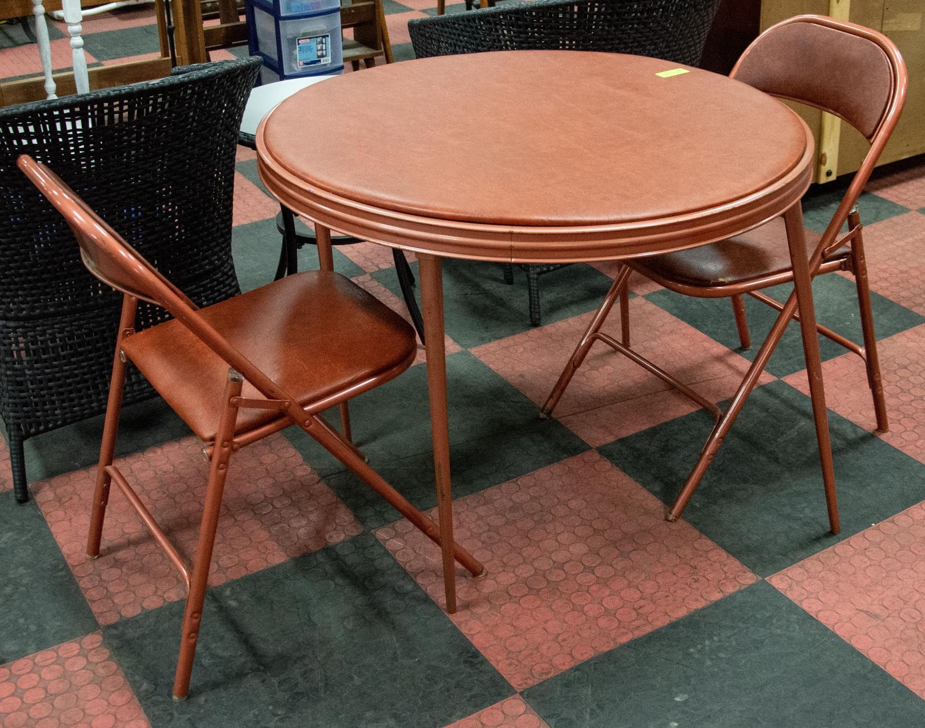 TABLE WITH 2 COPPER FOLDABLE PADDED CHAIRS (TABLE: 3 FT. DIAMETER X 28 INCHES TALL)