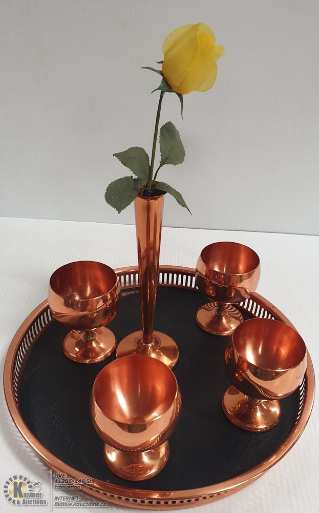 ROUND SERVING TRAY (13 " DIAMETER), 4 GOBLETS, 8" FLOWER VASE. ALL MADE BY COPPERCRAFT GUILD. NOTE: ONE GOBLET HAS MINOR STAIN INSIDE.-HOME
