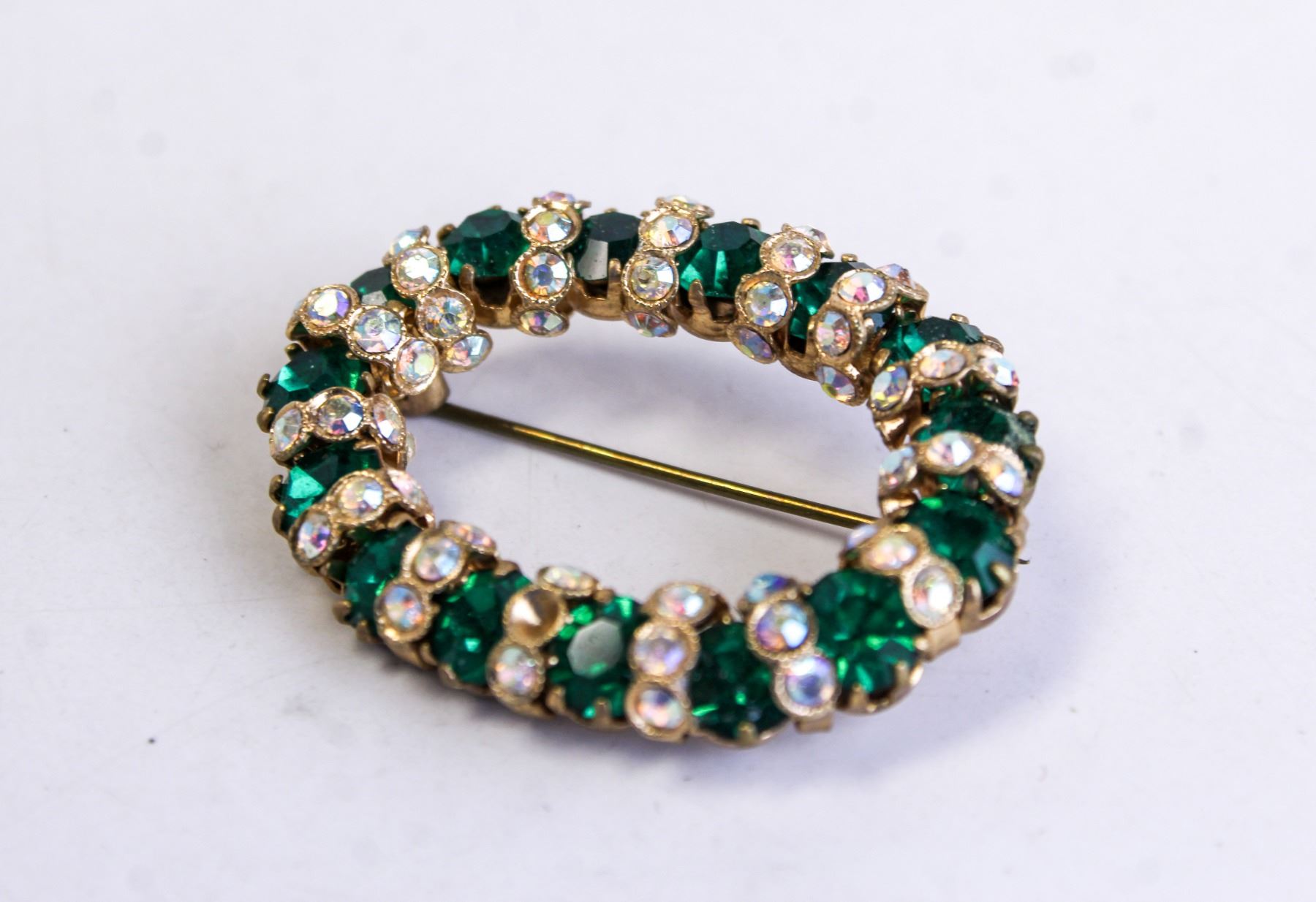 COSTUME BROOCH WITH GREEN AND BOREALIS STONES