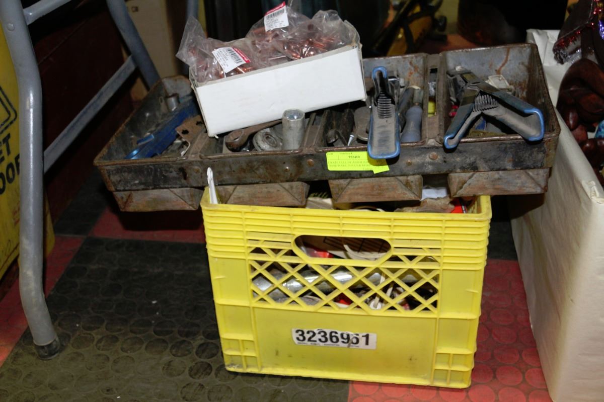 CRATE FULL OF ASSORTED HARDWARE, TOOLS & MORE
