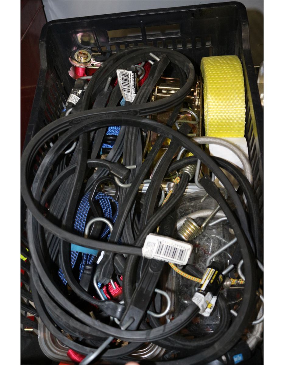 CRATE OF BUNGEE CORDS AND TIE DOWNS