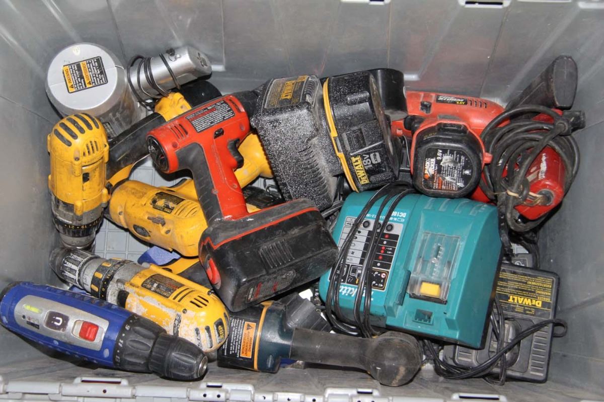 CRATE OF DRILLS,CHARGERS AND BATTERIES
