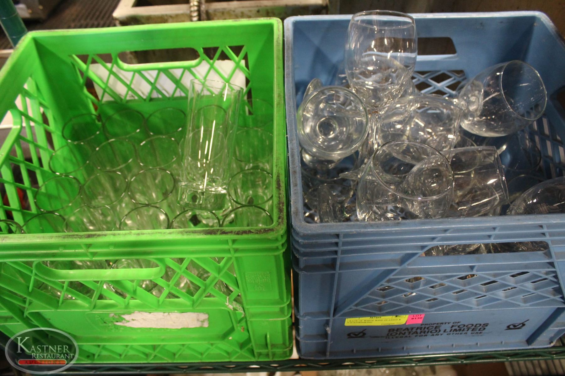 CRATE OF WHITE WINE GLASSES & JUICE/DRINKING
