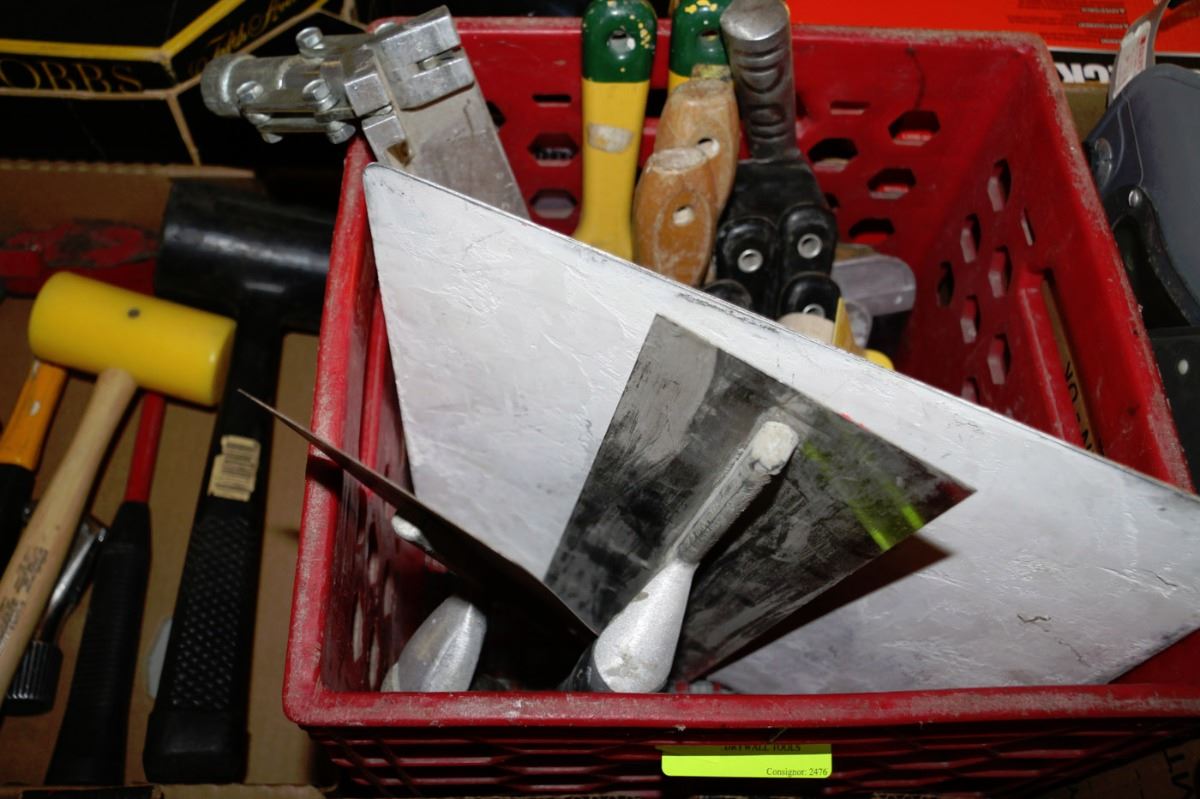 CRATE WITH DRYWALL TOOLS