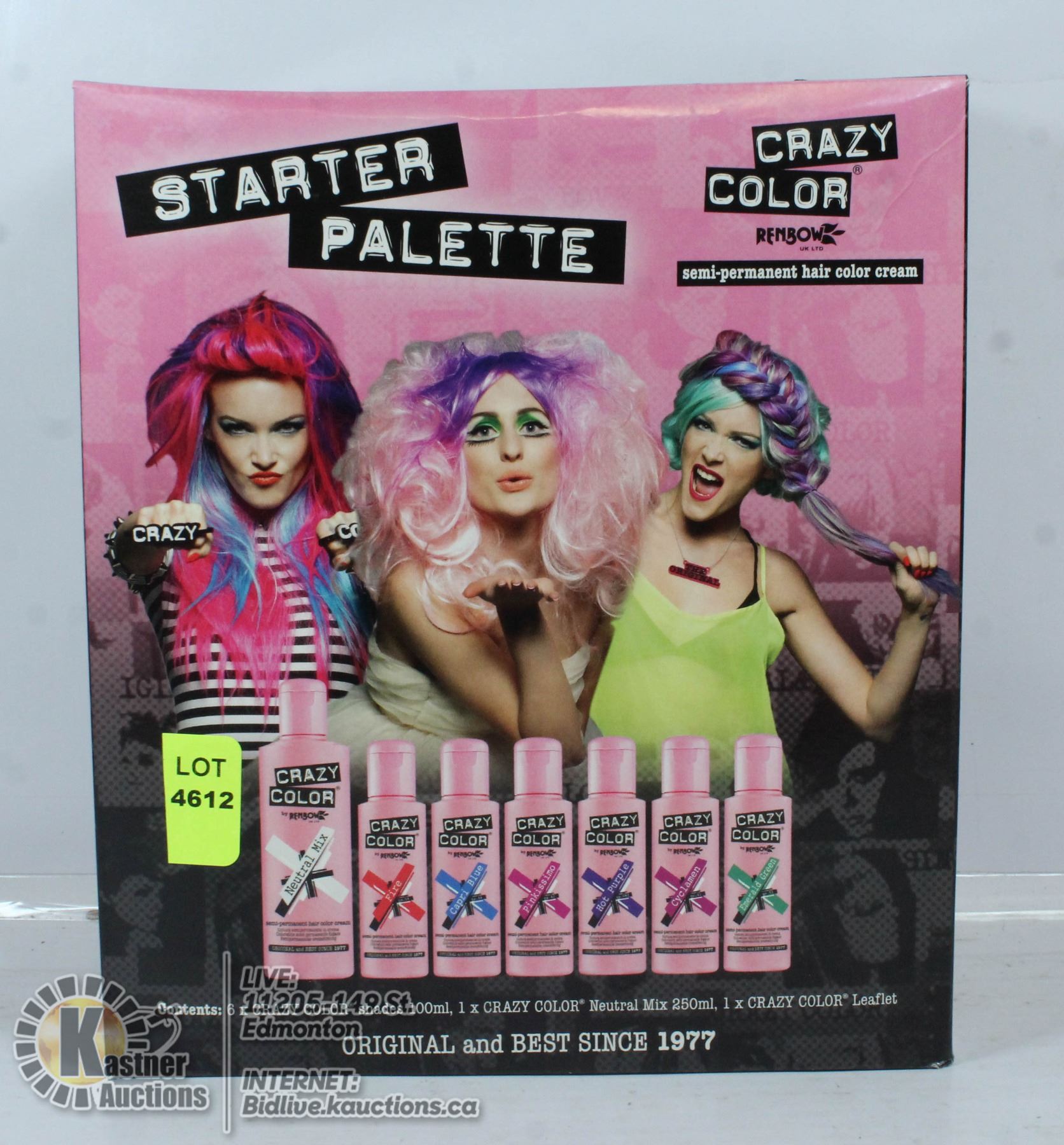 COLOR CREAM. PACKAGE INCLUDES 6 CRAZY COLOR SHADES: FIRE (RED), CAPRI BLUE, PINKISSIMO, HOT PURPLE, CYCLAMEN (PURPLE/PINK) AND EMERALD GREEN; 1 CRAZY COLOR NEUTRAL MIX AND 1 CRAZY COLOR LEAFLET.