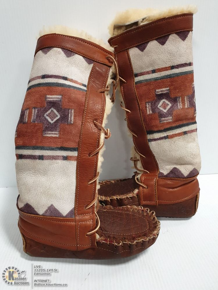 CROW NATIVE AMERICAN INDIAN HIGH TOP MOCCASINS. THE MOCCASINS ARE A TANNED HIDE CONSTRUCTION, WITH MINERAL OCHER DYED GEOMETRIC PATTERNS PAINTED ON THE EXTERIOR OF THE BOOTS. THE INSIDE OF THE MOCCASINS ARE LINED WITH PLUSH SHEEP SKIN, AND ARE CINCHED DOWN WITH LEATHER CORD. THE MOCCASINS ARE ALSO FINISHED WITH THICK RUBBER SOLES. THE EXTERIOR DIMENSION OF THE MOCCASINS EQUAL 16" TALL, AND 11" FROM THE HEEL TO TOE. THE MOCCASINS ARE A LADIES SIZE 7-CLOTHING