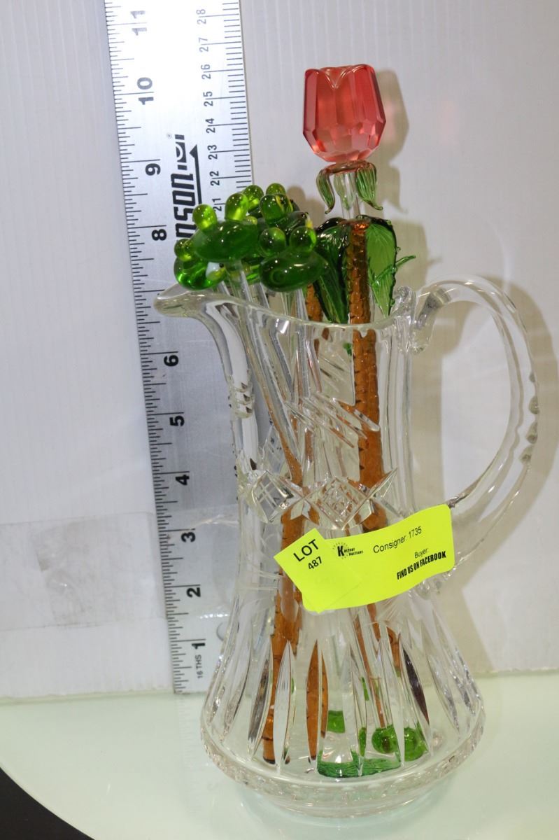 CRYSTAL PITCHER W ART GLASS STIR STICKS