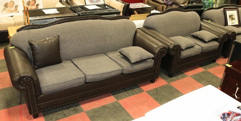 COUCH AND LOVE SEAT, ESPRESSO LEATHER AND GREY FABRIC, INCLUDES MATCHING PILLOWS.