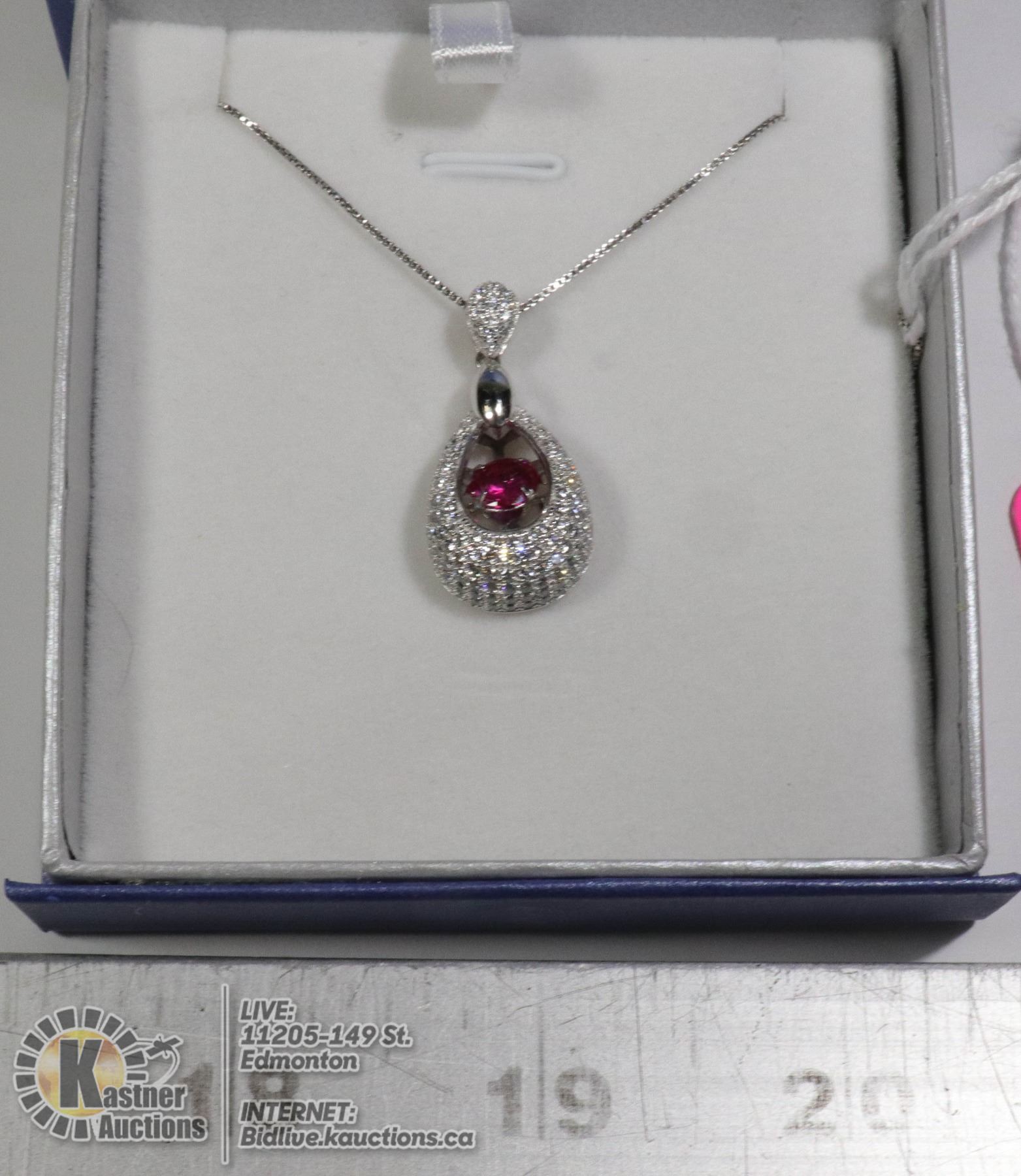 925 SILVER DANCING STONE. WHITE CZ. 28 X 13MM. RHODIUM PLATED. 1.0 CARAT RED CZ CENTER. LOOKS LIKE WHITE GOLD.5.7 GRAMS. RETAILS $240.00