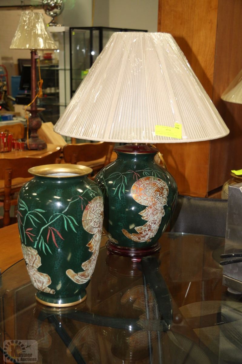 DARK GREEN LAMP WITH MATCHING DECORATIVE VASE